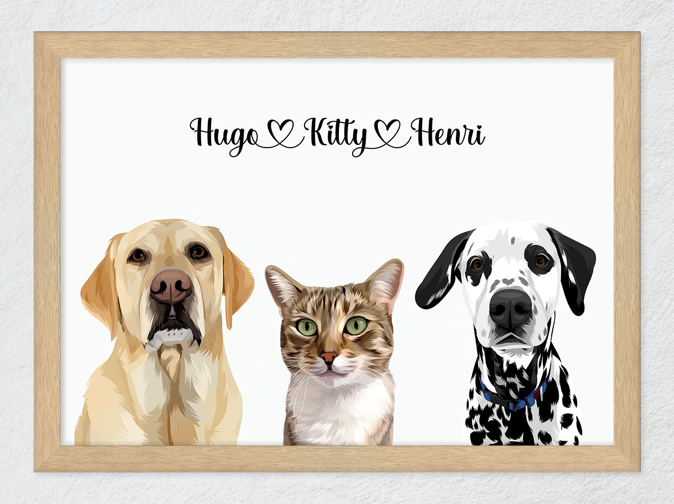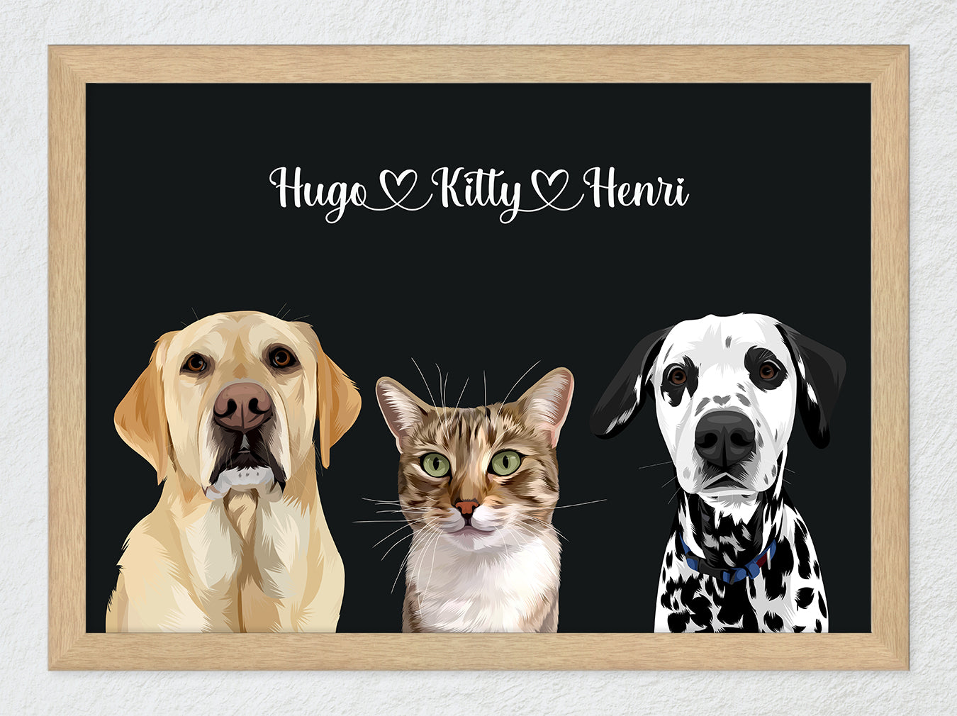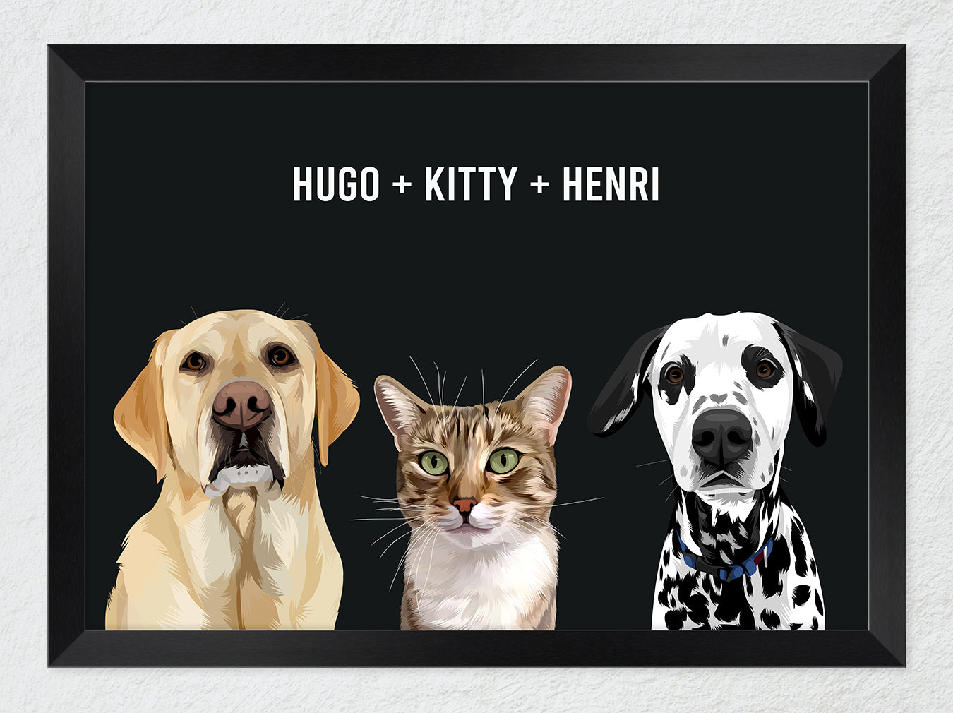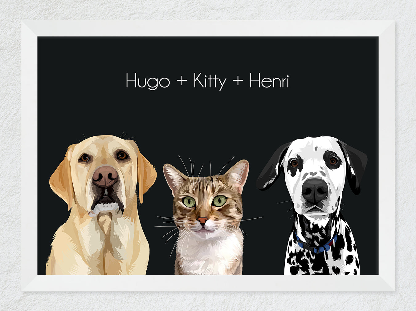 Two's company, three's a party! Create a lasting memory of your terrific trio with a custom three-pet portrait. Our framed portraits are printed on premium photo matte paper and framed on your choice of black, white, or natural timber, sustainably sourced and ready to hang. Frames are glazed with 2mm clear glass and packed securely in impact resistant corrugated cardboard.