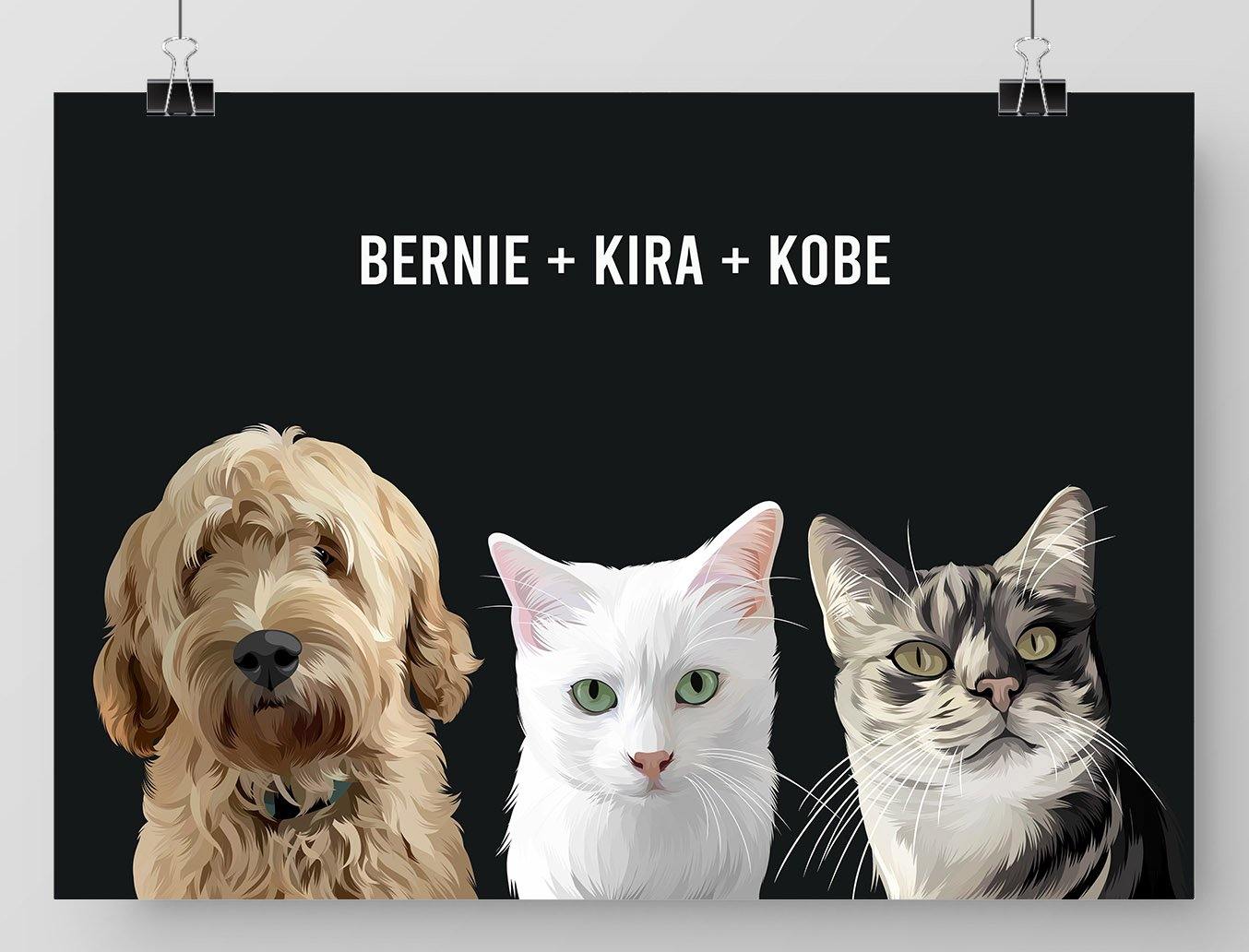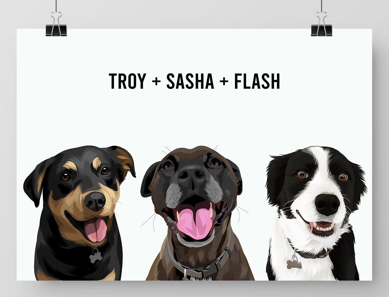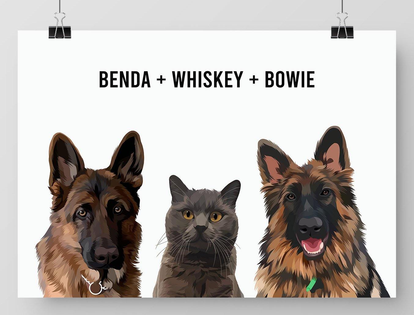 Two's company, three's a party! Create a lasting memory of your terrific trio with a custom three-pet portrait. All portraits are exported in high-resolution to highlight your pet's unique features.