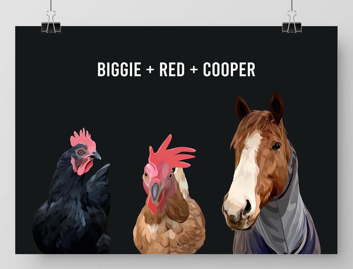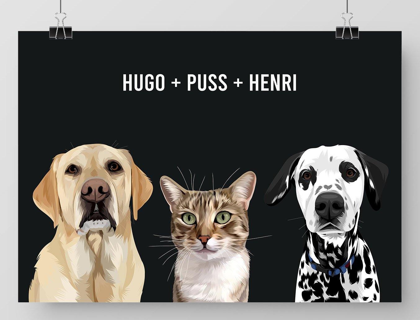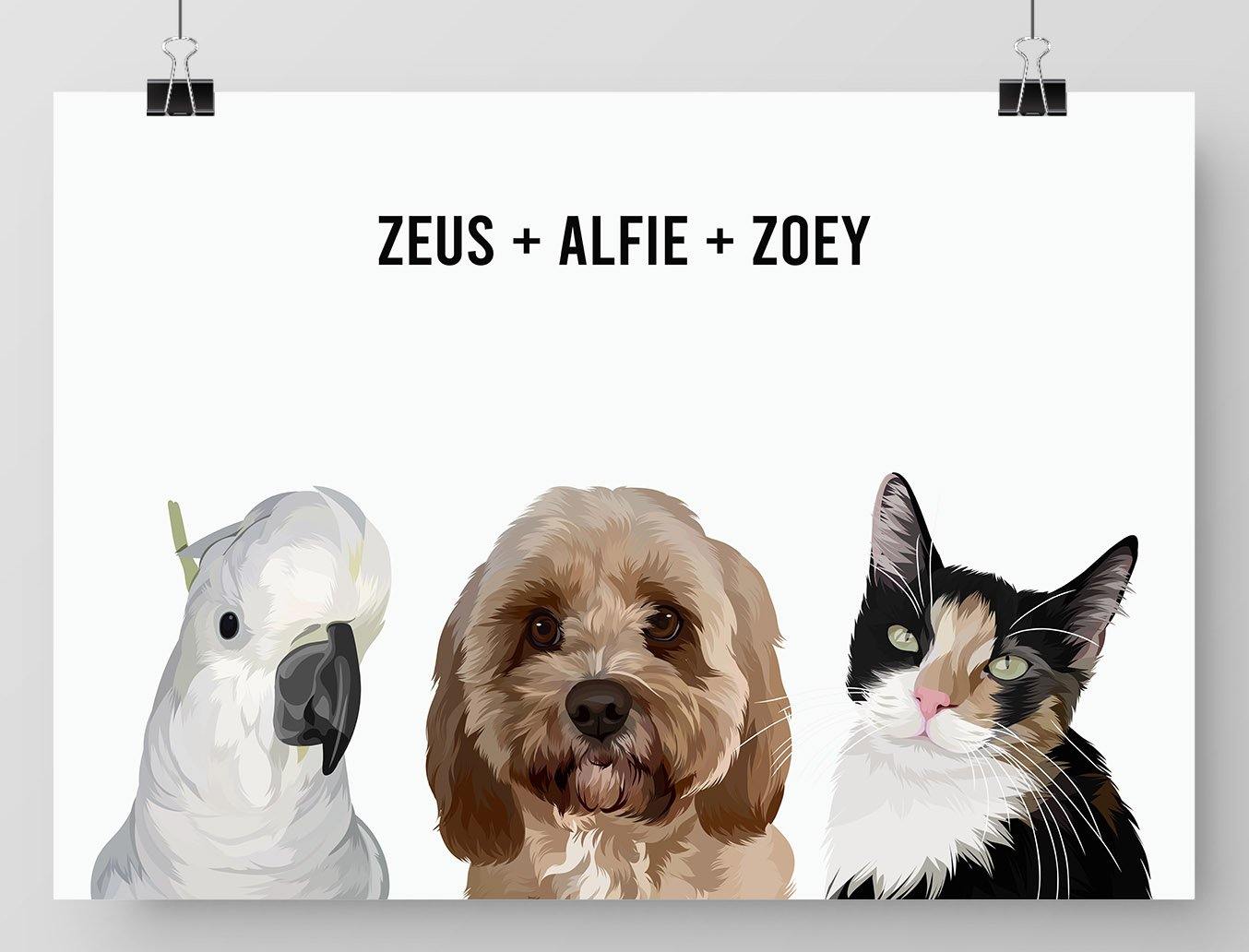 Two's company, three's a party! Create a lasting memory of your terrific trio with a custom three-pet portrait. All portraits are exported in high-resolution to highlight your pet's unique features.